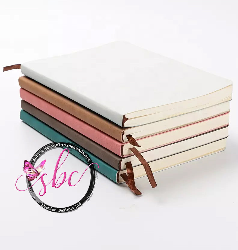 Sublimation notebooks in fabric and faux leather covers for personalization.